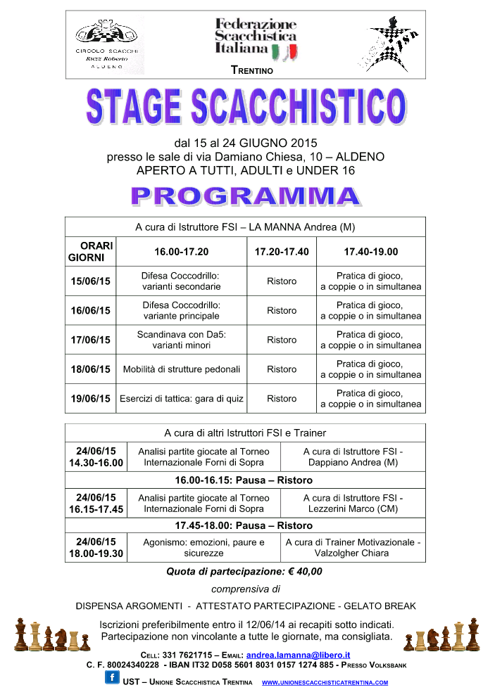 L’A.S.D.P.S. Unione Scacchistica Trentina in collaborazione con l’A.D. Scacchi “R. Ruzz” Aldeno organizza uno stage aperto a tutti gli interessati, adulti e junior.