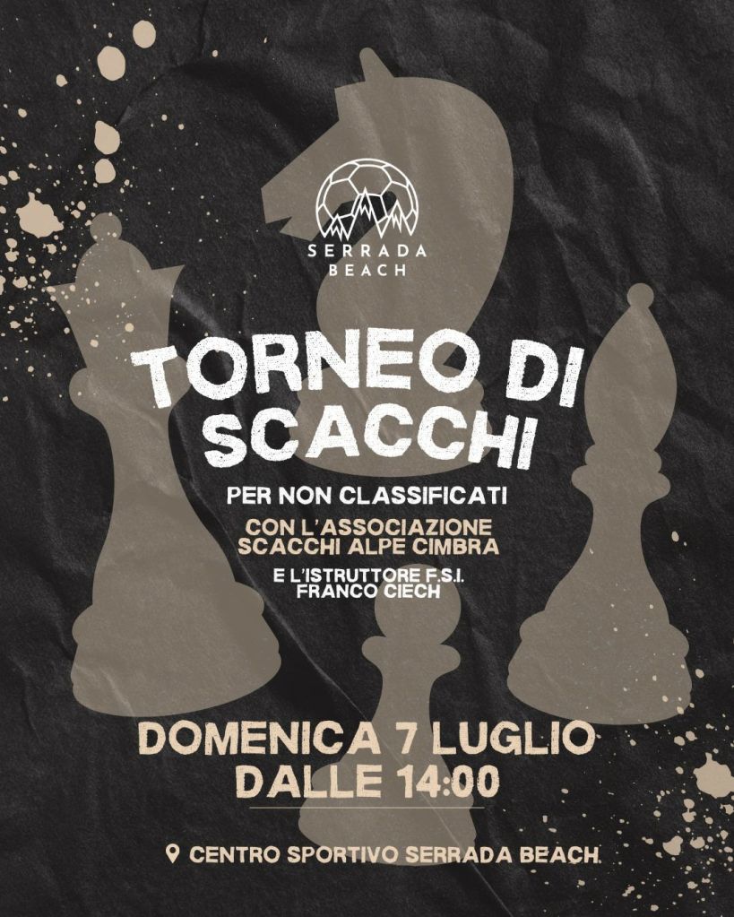 Serrada Beach Immagine 03/07/202407/07/2024 Robbi Giocatori, PromozioneFolgaria, Giocatori, Promozione, Tornei Torneo amatoriale per turisti e locali al Serrada Beach di Folgaria 😃♟️curato da ASD SCACCHI ALPE CIMBRA. Condividi: Fai clic per condividere su X (Si apre in una nuova finestra) X Fai clic per condividere su Facebook (Si apre in una nuova finestra) Facebook Mi piace Caricamento...