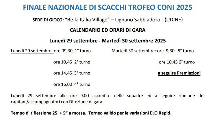 Al via il weekend dedicato ai giovani Scacchisti con il torneo di qualificazione alle finali del Trofeo CONI di Lignano Sabbiadoro a fine ottobre.