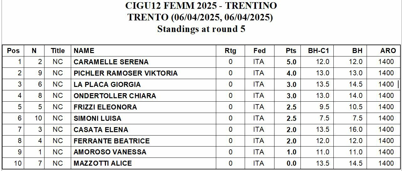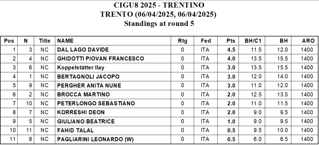 Un plauso particolare all’Arbitro del torneo Battiston Claudio che tra corsi di scacchi, lavoro e famiglia è riuscito a dedicarci questa giornata e all’Istruttore Michele Martinelli per la presenza e l’impegno costanti.