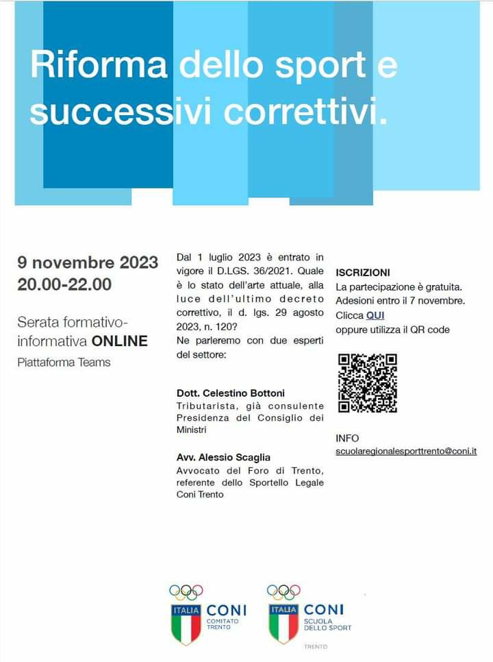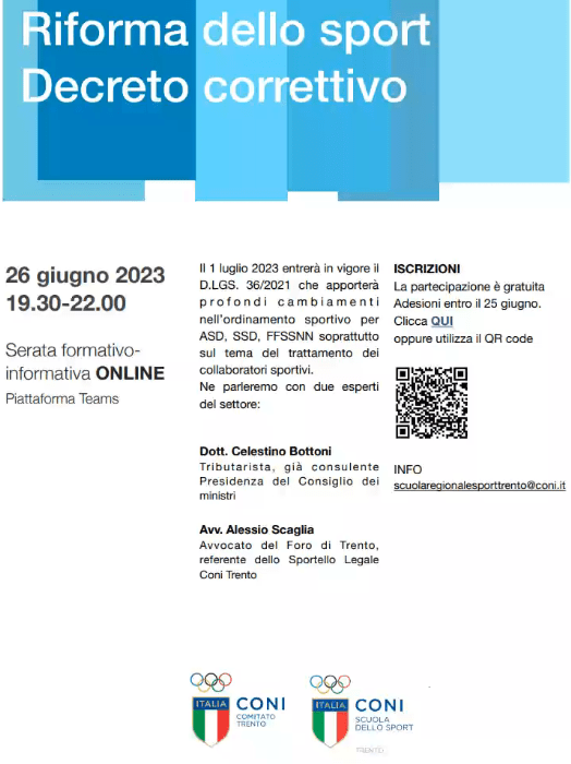 La Scuola Regionale dello Sport del CONI Trento vi invita a partecipare ad un incontro informativo sul tema che si svolgerà ONLINE lunedì 26 giugno 2023 dalle 19.30.