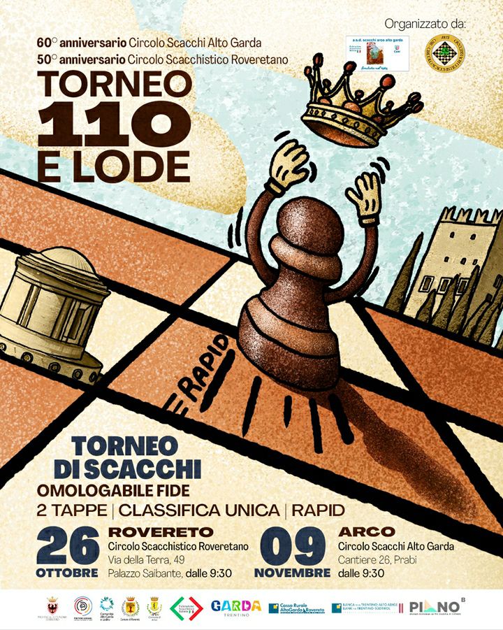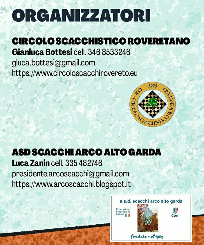 Altri due appuntamenti ufficiali FIDE RAPID regalati al Trentino dalle due Associazioni scacchistiche di Arco e Rovereto, per festeggiare con l’occasione i tanti anni della loro attività associativa.