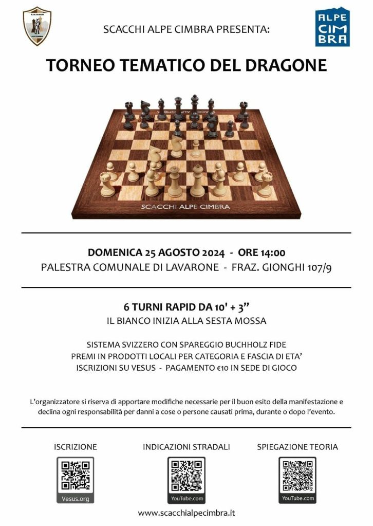 Il circolo Scacchi Alpe Cimbra organizza per domenica 25 agosto 2024 alle 14.00 in palestra comunale di Lavarone un